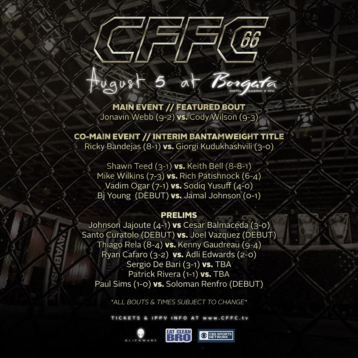 In the main event of the evening, former CFFC welterweight champion and UFC veteran Jonavin "The Spider" Webb (9-2) is set to face Cody Wilson (9-3).