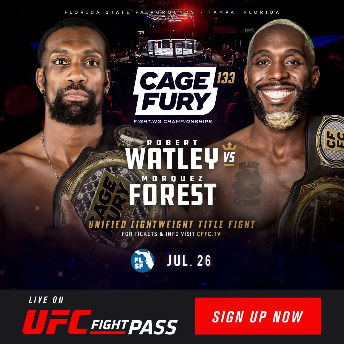 ATLANTIC CITY, N.J. – Cage Fury Fighting Championships (CFFC) history will be made on Friday, July 26, when the organization returns to Tampa's Florida State Fairgrounds to host the first title unification bout in company history at "CFFC 133: Watley vs. Forest."