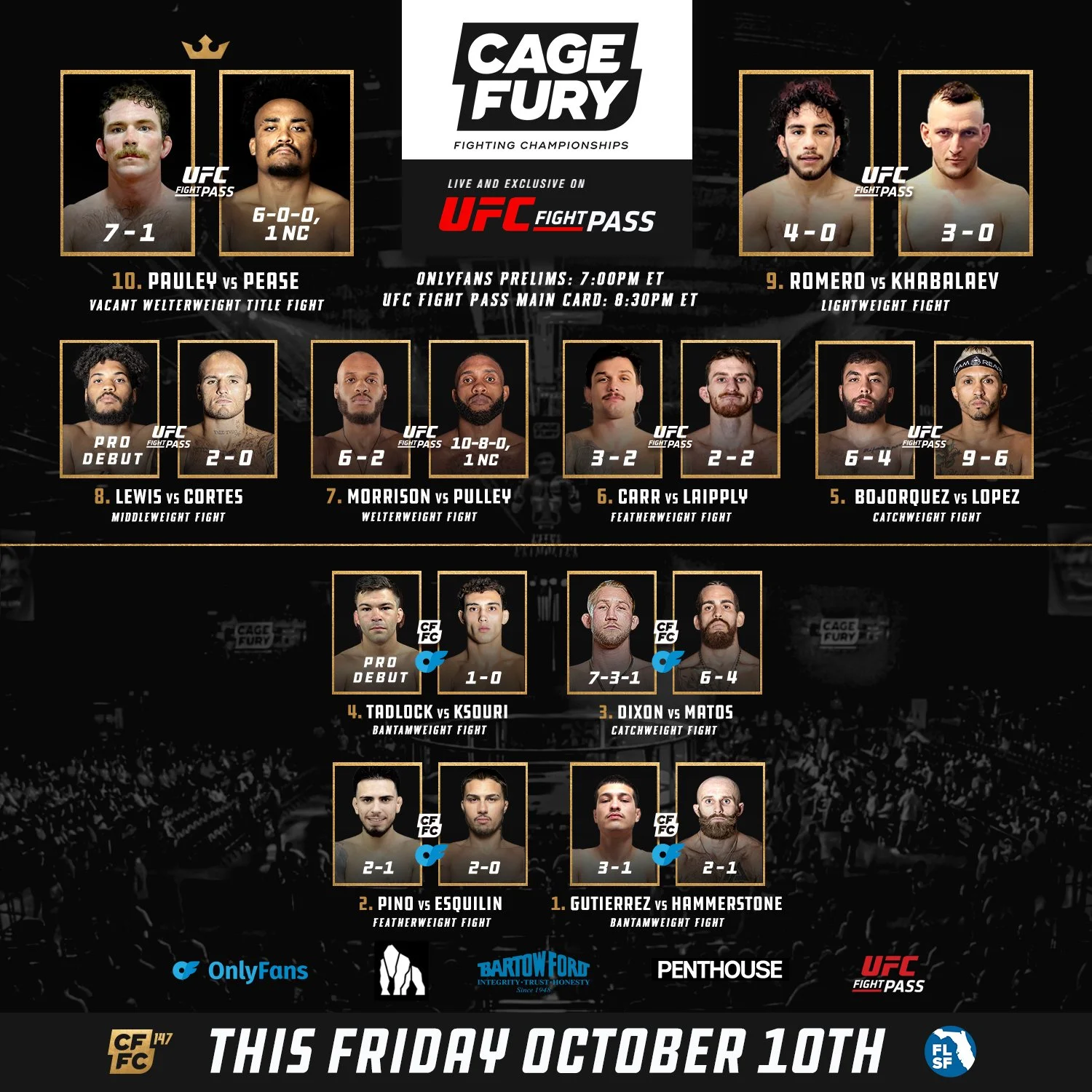 Meanwhile, the night's four-bout preliminary lineup streams live beginning at 7 p.m. ET exclusively on OnlyFans.com/cffcmma, the subscription-based social media platform built for creators and fans.