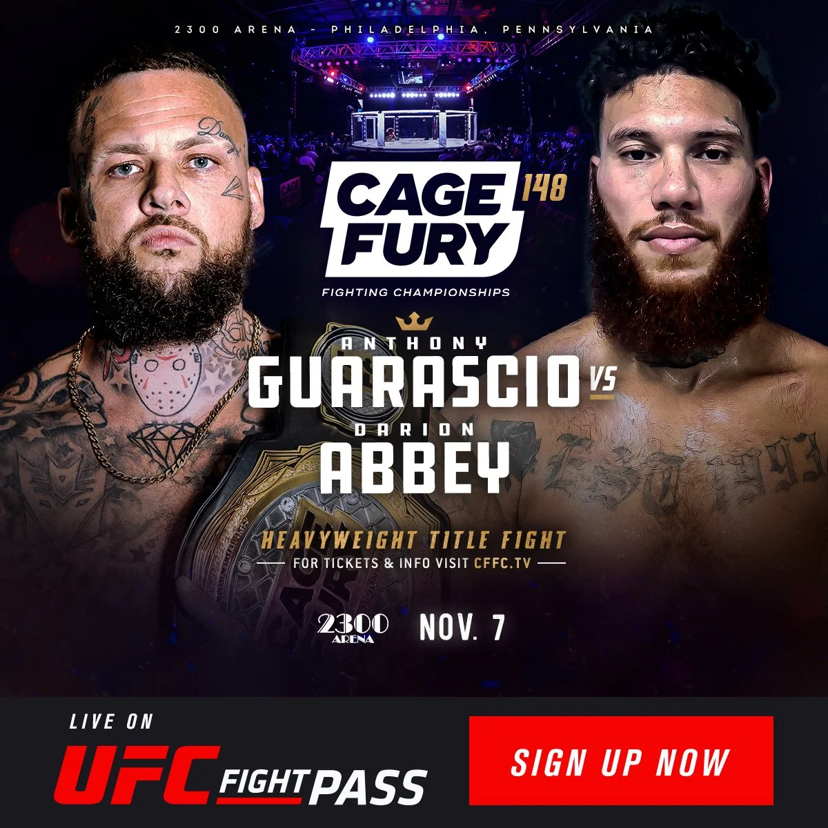 ATLANTIC CITY, N.J. – Cage Fury Fighting Championships (CFFC) officials are excited to confirm the details of the promotion's return to Philadelphia's legendary 2300 Arena on Friday, November 7, for "CFFC 148: Guarascio vs. Abbey."