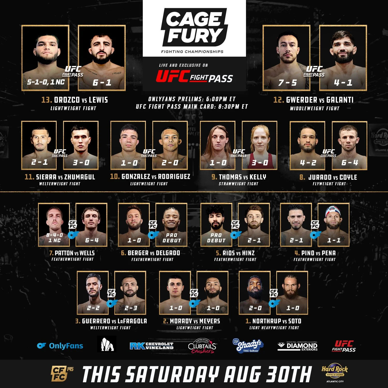 Northrup was an undefeated amateur and has earned two wins as a professional, both by knockout, while also making stops at Karate Combat and Gamebred Bareknuckle MMA. Meanwhile, made his professional debut under the CFFC banner, picking up a decision win, and has also gone unbeaten in three appearances for CFFC BJJ. However, he recently turned his attention to boxing, going 3-0 with three first-round knockouts in just the past six months.