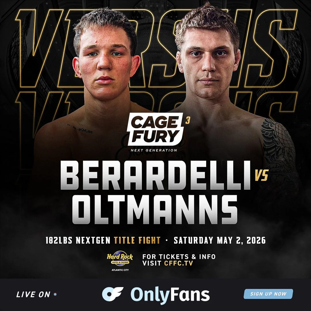 Featuring a pair of championships matchups at the top of the bill and utilizing the New Jersey State Athletic Control Board's designated weight classes, "CFFC NextGen 3: Berardelli vs. Oltmanns" will once again feature top developing talent squaring off in an intimate venue, ensuring an electric atmosphere and non-stop entertainment from start to finish.